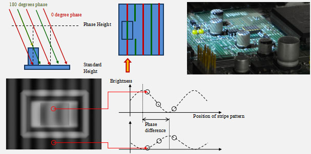 SAKI在線在線AOI自動(dòng)光學(xué)檢測(cè)儀BF-3Di使用多組條紋光系統(tǒng).通過(guò)投射寬窄模式的黑白條紋光,可以穩(wěn)定地精確測(cè)量出各種類型元件的高度信息.例如:0402mm元件,黑色的IC本體,以及鏡面材質(zhì)的元件.