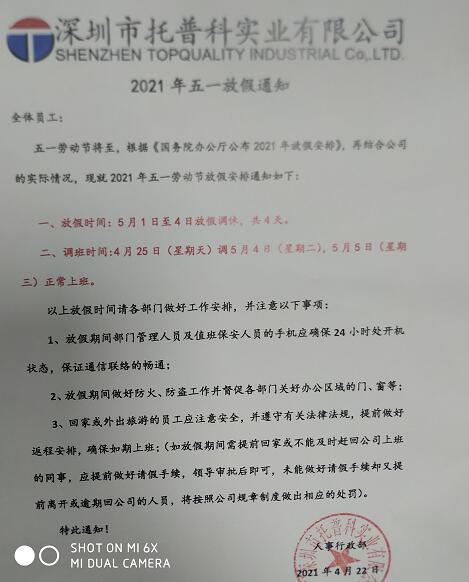 現將深圳托普科實業五一放假通知公布如下:
