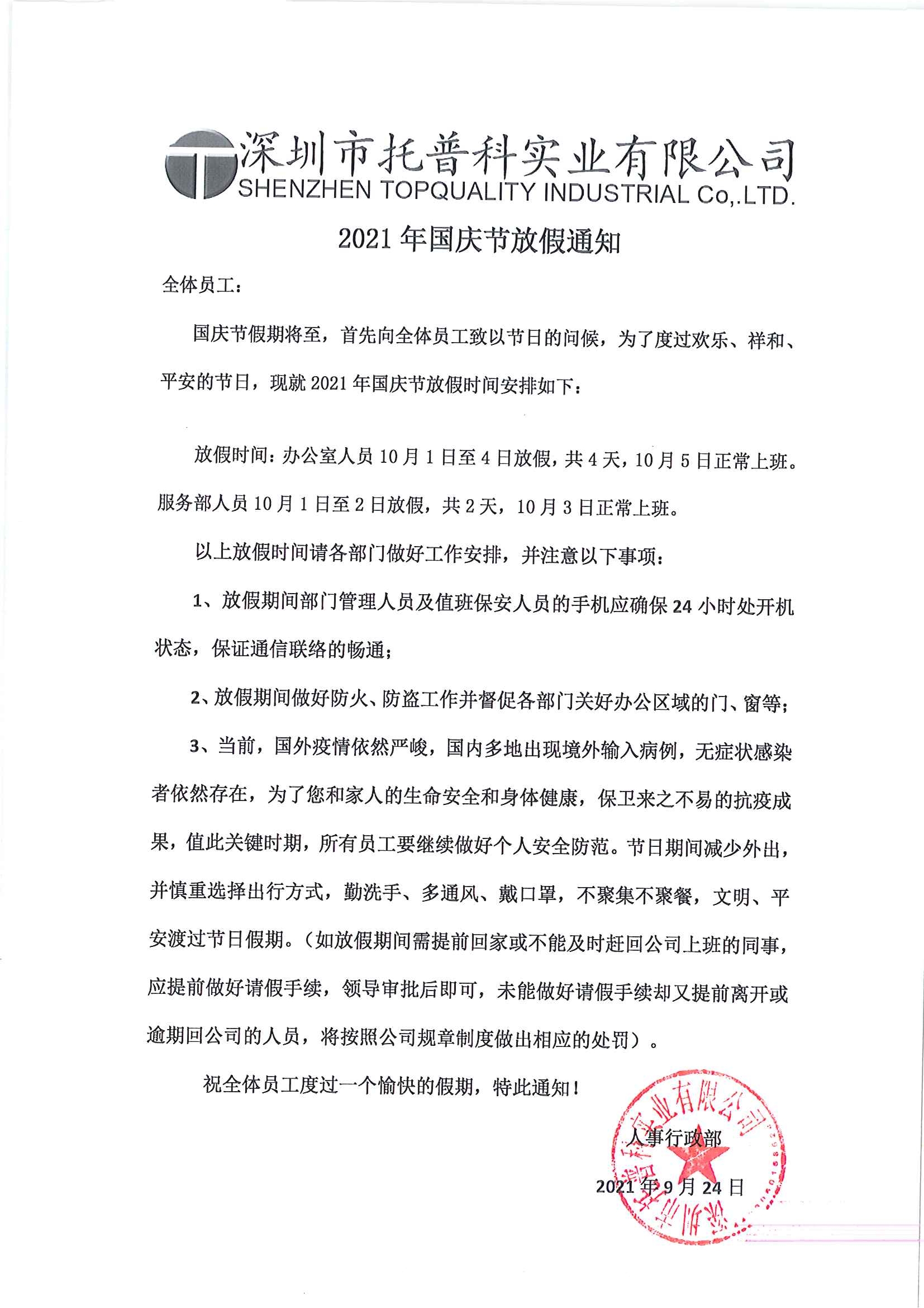 深圳托普科2021國慶節放假通知
