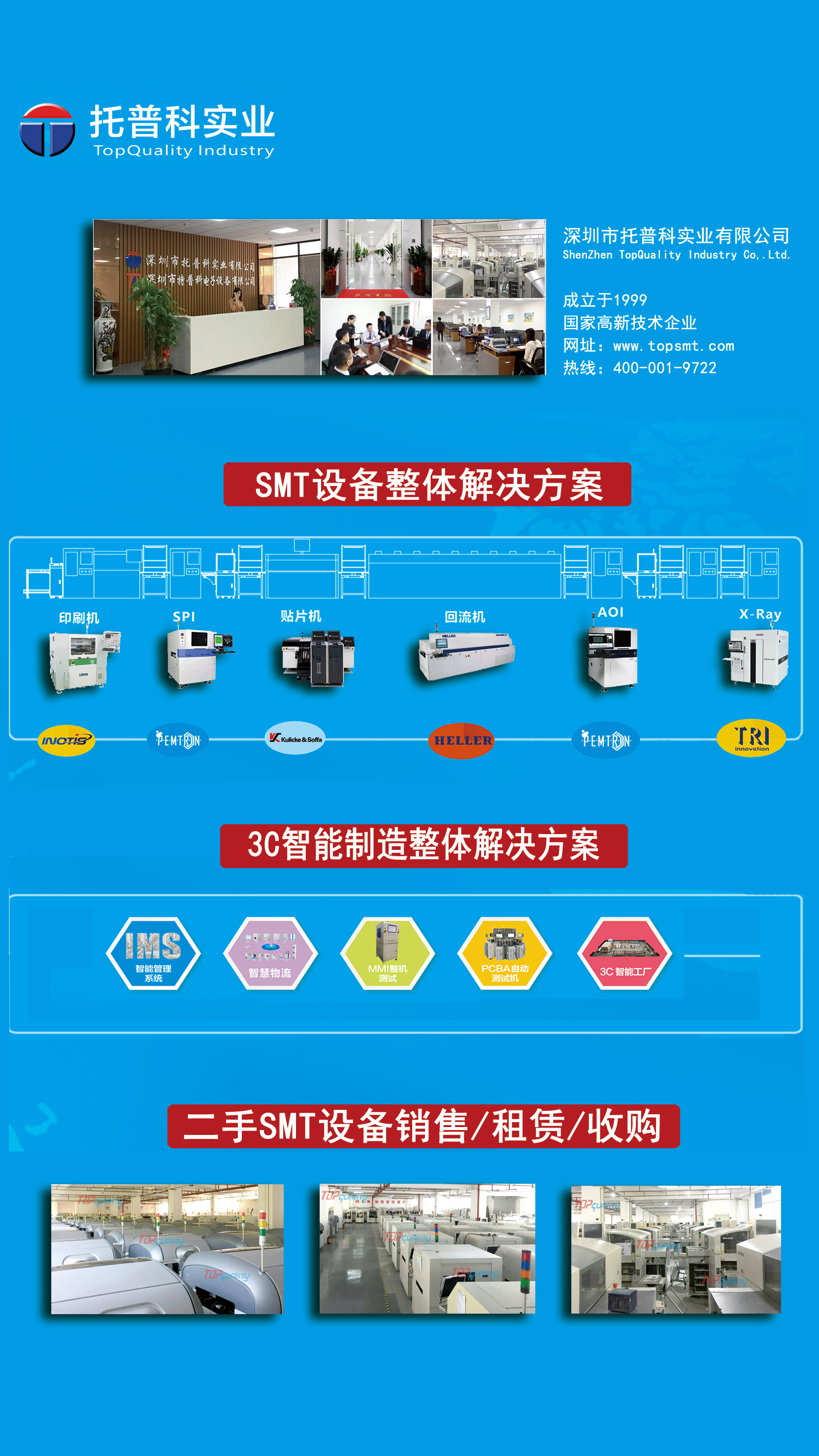 深圳市托普科實業有限公司是一家高科技術公司,專業提供二手及全新SMT設備,(貼片機,回流焊,波峰焊,印刷機,AOI,SPI)收銷/租賃/維修以及SMT周邊所有設備研發、生產,銷售為一體,產品有:(板機、下板機、接駁臺、平行移載機、雙軌機、跌板機、真空吸板機、緩存機、NG/OK收板機、印刷機、及各類工業控制系統開發,配件銷售)提供一站式SMT貼裝解決方案。